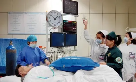一般情况下,一名胸痛病人从到医院急诊室再到进入导管室打通血管用时约为110分钟。徐矿总医院通过成立“胸痛中心”,实现了急性心梗患者救治的“一键式”启动,首先在急救车上部署远程传输系统,当急救车接到病人后10分钟内完成心电图采集,对急性心梗等生命体征作出诊断,并将这些信息远程传输给徐矿总医院胸痛中心控制台,经专家确定为心梗后,控制台一键启动导管室、心内科及手术医师。同时,实施“先救治、后收费”制度,病人直接送到手术室进行手术治疗。通过启动一键式急救,能够让抢救时间缩短至70分钟,大大的提高了患者的生存率和康复率。