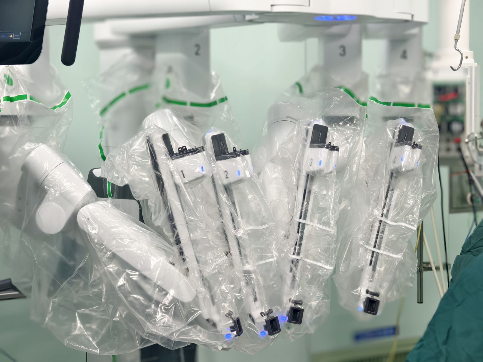 手术当日,各项术中环节紧密衔接,整个医疗团队配合默契。达芬奇机器人手术系统由医生控制台、床旁机械臂和高清影像系统构成。麻醉生效后,团队医生在张大爷腹部打了4个直径约0.5~1厘米的微小切口,将机械臂与高清摄像头探入腹腔。